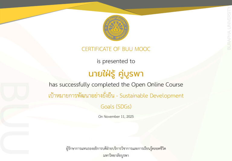 BUU MOOC : Learn without limit แพลตฟอร์มการเรียนรู้ออนไลน์เพื่อการเรียนรู้ตลอดชีวิต มหาวิทยาลัยบูรพา ดูเพิ่มเติม Become to "Lifelong Learner" on BUU MOOC ผู้เรียน 0 K+ รายวิชาทั้งหมด 0 + ลงเรียน (ครั้ง) 0 K+ ใบเซอร์ที่ออก 0 K+ BUU MOOC แพลตฟอร์มการเรียนรู้ออนไลน์จากมหาวิทยาลัยบูรพา ที่พัฒนาขึ้นเพื่อส่งเสริมการเรียนรู้ตลอดชีวิต เปิดโอกาสให้ประชาชนทั่วไปสามารถเข้าถึงองค์ความรู้ได้อย่างเท่าเทียม และสามารถรับประกาศนียบัตรหลังสำเร็จการศึกษาในแต่ละรายวิชา ประกาศนียบัตร รับรองความสามารถตามมาตรฐานหลักสูตร เรียนรู้ได้ทุกช่วงวัย หลักสูตรเปิดกว้างสำหรับทุกคน เรียนรู้แบบ Onlineเรียนรู้ผ่าน Online Platform สะสมหน่วยกิต เข้าร่วมโครงการ PRE-BUU Course หลักสูตรออนไลน์ BUU MOOC จากคณะและส่วนงานภายในมหาวิทยาลัย เศรษฐศาสตร์เกษตร 💵 ไม่มีค่าใช้จ่าย 🏢 คณะมนุษยศาสตร์และสังคมศาสตร์ การประยุกต์ใช้ AI ในการทำงานวิจัย 💵 ไม่มีค่าใช้จ่าย 🏢 สำนักคอมพิวเตอร์ การใช้งาน Arduino ขั้นพื้นฐาน 💵 ไม่มีค่าใช้จ่าย 🏢 คณะวิศวกรรมศาสตร์ การดูแลสุขภาพจิตเบื้องต้น 💵 ไม่มีค่าใช้จ่าย 🏢 คณะมนุษยศาสตร์และสังคมศาสตร์ ภาษาอังกฤษเพื่อการสื่อสาร 💵 ไม่มีค่าใช้จ่าย 🏢 สถาบันภาษา ภาษาและวัฒนธรรมฝรั่งเศสเพื่อการท่องเที่ยว 💵 ไม่มีค่าใช้จ่าย 🏢 คณะมนุษยศาสตร์และสังคมศาสตร์ การตลาดเชิงเนื้อหาเพื่อสื่อใหม่ 💵 ไม่มีค่าใช้จ่าย 🏢 คณะมนุษยศาสตร์และสังคมศาสตร์ สำรวจโลกแห่งการออกแบบ 💵 ไม่มีค่าใช้จ่าย 🏢 คณะศิลปกรรมศาสตร์ ภาษาญี่ปุ่นในบริบทการทำงาน 💵 ไม่มีค่าใช้จ่าย 🏢 คณะมนุษยศาสตร์และสังคมศาสตร์ เทคนิคการจัดฝึกอบรม 💵 ไม่มีค่าใช้จ่าย 🏢 สำนักบริการวิชาการ เป้าหมายการพัฒนาอย่างยั่งยืน 💵 ไม่มีค่าใช้จ่าย 🏢 ฝ่ายการเรียนรู้ตลอดชีวิต ทฤษฎีดนตรีสากลเบื้องต้น 💵 ไม่มีค่าใช้จ่าย 🏢 คณะดนตรีและการแสดง ดูเพิ่มเติม Learning transforms lives Education is the most powerful weapon for changing the world. ใบประกาศนียบัตรรับรองการผ่านหลักสูตรบน BUU MOOC เพราะการเรียนรู้ ไม่มีที่สิ้นสุด BUU MOOC แพลตฟอร์มการเรียนรู้ออนไลน์เพื่อการเรียนรู้ตลอดชีวิต