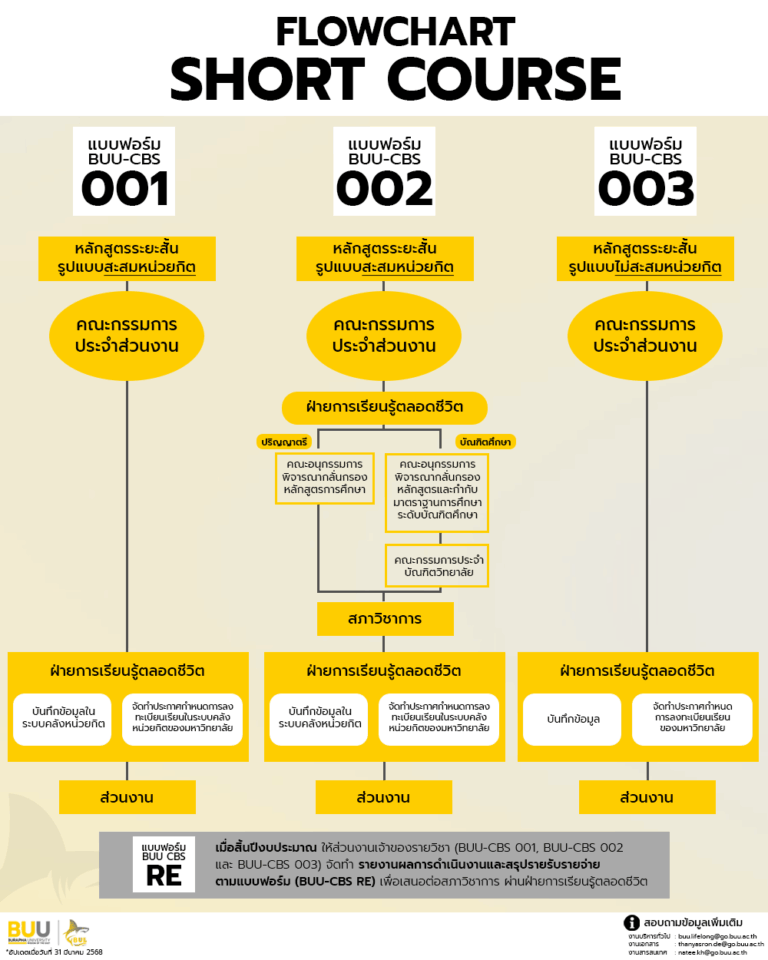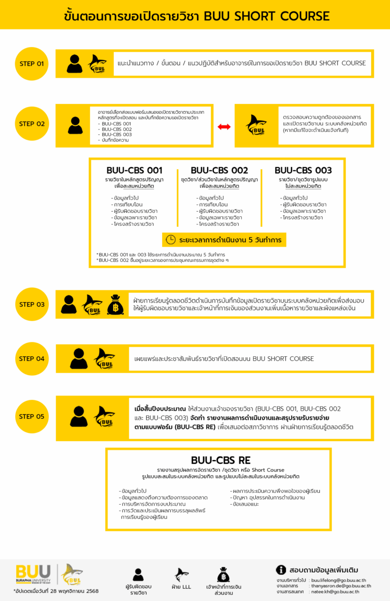 SHORT COURSE ฝ่ายการเรียนรู้ตลอดชีวิต มหาวิทยาลัยบูรพา แนวปฏิบัติในการเสนอ SHORT COURSE เพื่อสะสมในระบบคลังหน่วยกิต▶แนวปฏิบัติในการเสนอหลักสูตระยะสั้นเพื่อสะสมในระบบคลังหน่วยกิต มหาวิทยาลัยบูรพา แนวฟอร์มการเสนอรายวิชา / SHORT COURSE▶แบบฟอร์มการเสนอรายวิชา/ชุดวิชา เพื่อสะสมในระบบคลังหน่วยกิต มหาวิทยาลัยบูรพา (BUU-CBS 001) (Update 26 พฤศจิกายน 2568)▶แบบฟอร์มการเสนอ Short course เพื่อสะสมในระบบคลังหน่วยกิต มหาวิทยาลัยบูรพา (BUU-CBS 002) (Update 26 พฤศจิกายน 2568)▶แบบฟอร์มการเสนอ Short course รูปแบบไม่สะสมในระบบคลังหน่วยกิต มหาวิทยาลัยบูรพา (BUU-CBS 003) (Update 26 พฤศจิกายน 2568)▶แบบฟอร์มรายงานสรุปผลการจัดรายวิชา/ชุดวิชา เพื่อสะสมในระบบคลังหน่วยกิต มหาวิทยาลัยบูรพา (BUU-CBS RE) (Update 10 กันยายน 2568) BUU SHORT COURSE ASSET▶ตราสัญลักษณ์ คู่มือการใช้งาน▶ขั้นตอนการลงทะเบียนเรียน▶การใช้งานระบบคลังหน่วยกิตสำหรับผู้เรียน▶การใช้งานระบบคลังหน่วยกิตสำหรับผู้สอน ขั้นตอนการดำเนินงาน เพราะการเรียนรู้ ไม่มีที่สิ้นสุด หลักสูตรระยะสั้นที่ออกแบบมาเพื่อ Upskill Reskill Newskill ให้กับผู้เรียนทุกช่วงวัย